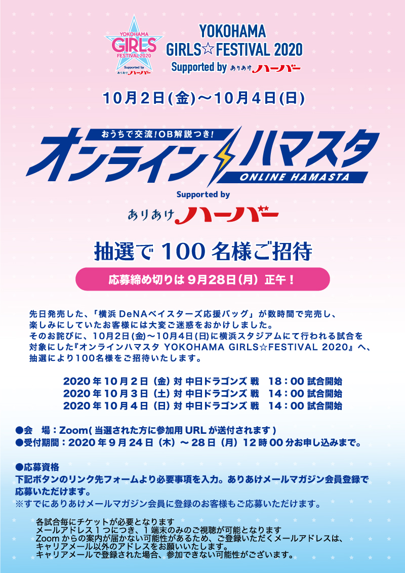 そのお詫びに、10月2日(金)~10月4日(日)に横浜スタジアムにて行われる3試合を対象にした『オンラインハマスタ YOKOHAMA GIRLS☆FESTIVAL 2020』へ、抽選により100名様をご招待いたします。