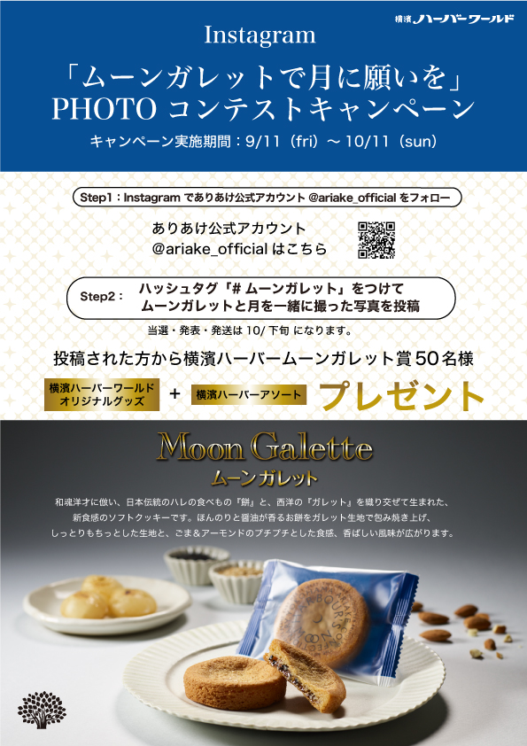 ありあけ公式アカウント @ariake_officialをフォロー、『#ムーンガレット」をつけて、ムーンガレットと月にちなんだ写真をInstagramにアップされたお客様の中から、『横濱ハーバームーンガレット賞』として50名様に横濱ハーバーワールドオリジナルグッズと横濱ハーバーアソートをプレゼントいたします。