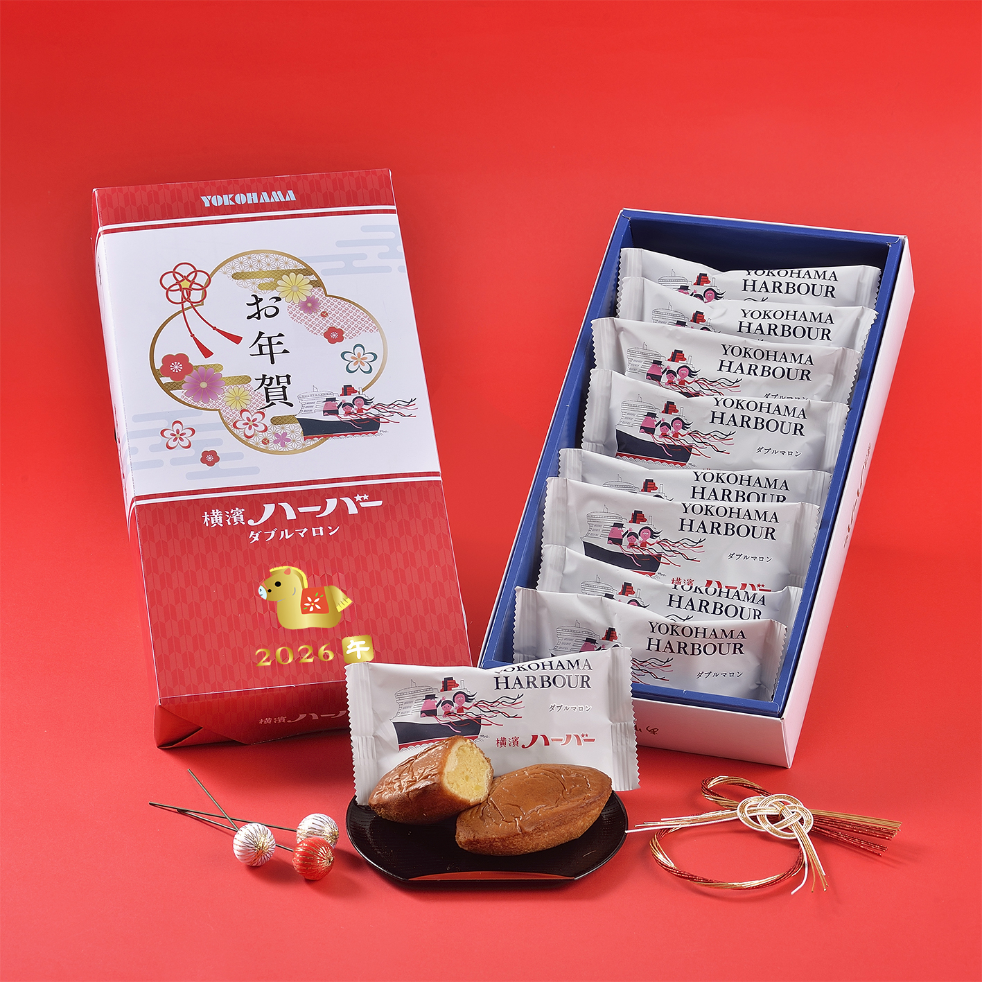 毎年好評のお正月限定パッケージ。2026年の干支「午」(うま)とともに、縁起のよい日本の伝統文様を取り入れ、新年が良い年となるよう願いを込めています。年号と干支イラスト部分を箔押しに仕上げた、新年のお祝い・ご挨拶にぴったりな商品です。中身は港・ヨコハマの船をイメージし伝統の製法で焼き上げた贅沢なマロンケーキ「横濱ハーバー ダブルマロン」8個入りです。