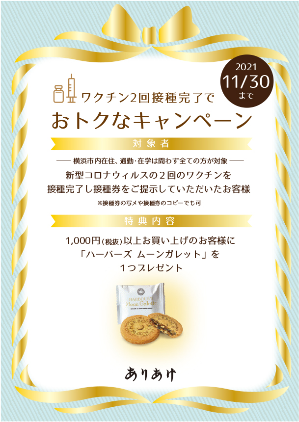 現在ありあけは、横浜市、横浜商工会議所、横浜市商店街総連合会3者が共同で行っている「ワクチンplusキャンペーン」に参加しています。